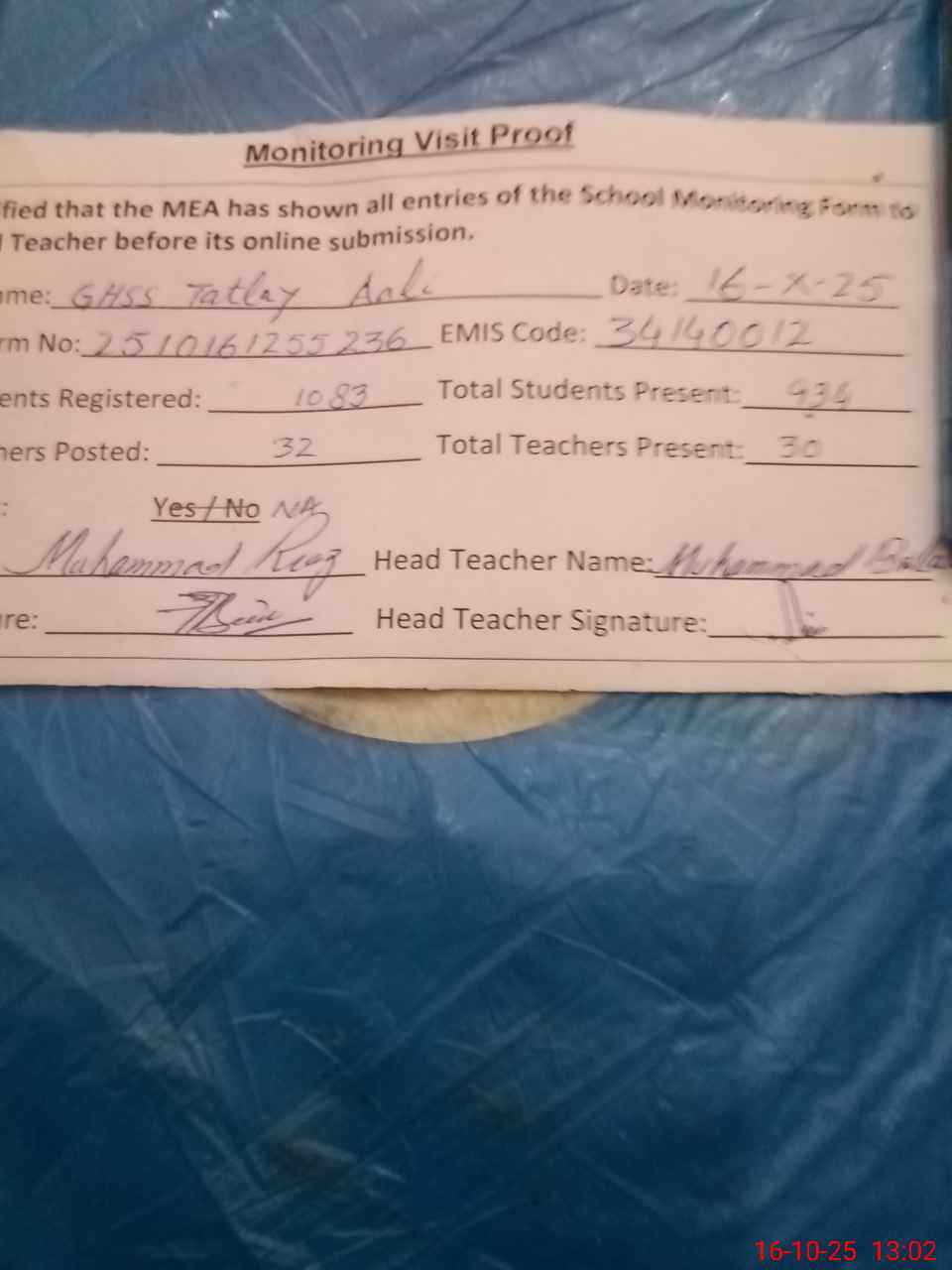 | EMIS Code: 34140012 | Name of School: GHSS TATLAY AALI | |||