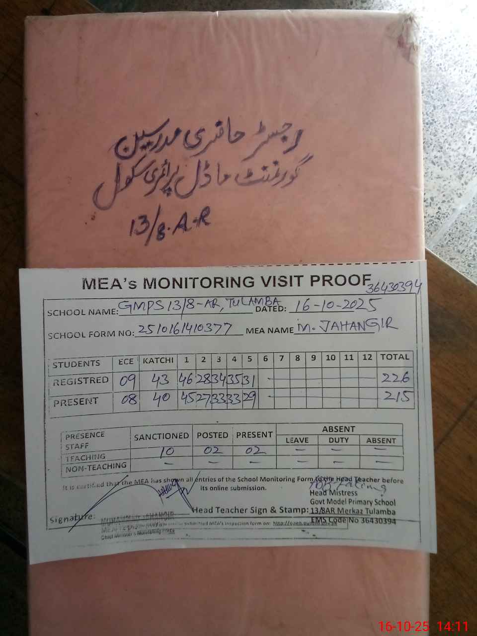| Attendance Register | Head Teacher | MEA with School | Visit Proof |
