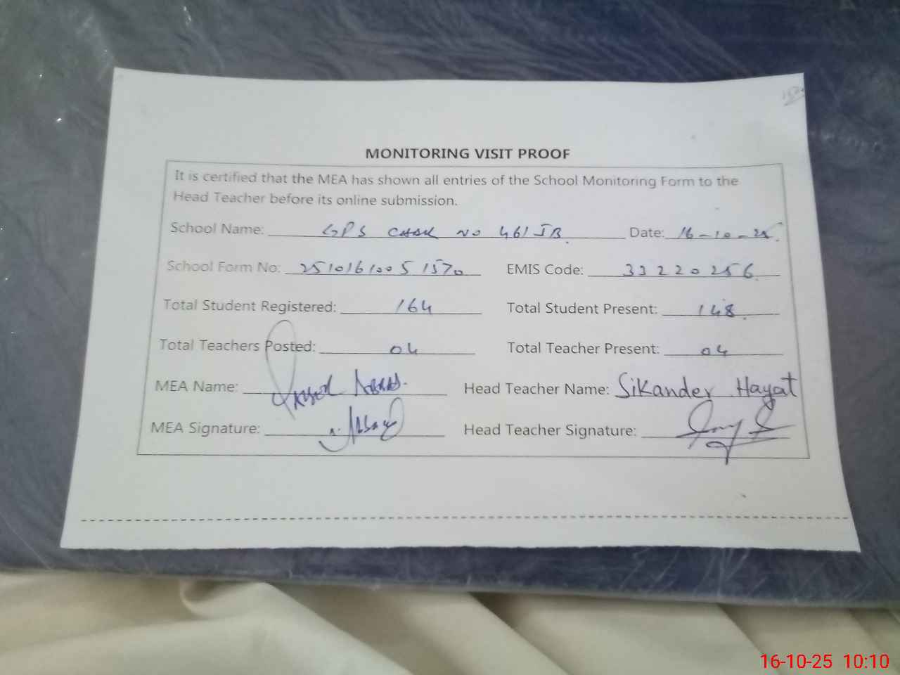 | EMIS Code: 33220256 | Name of School: GPS CHAK NO 461 JB | |||