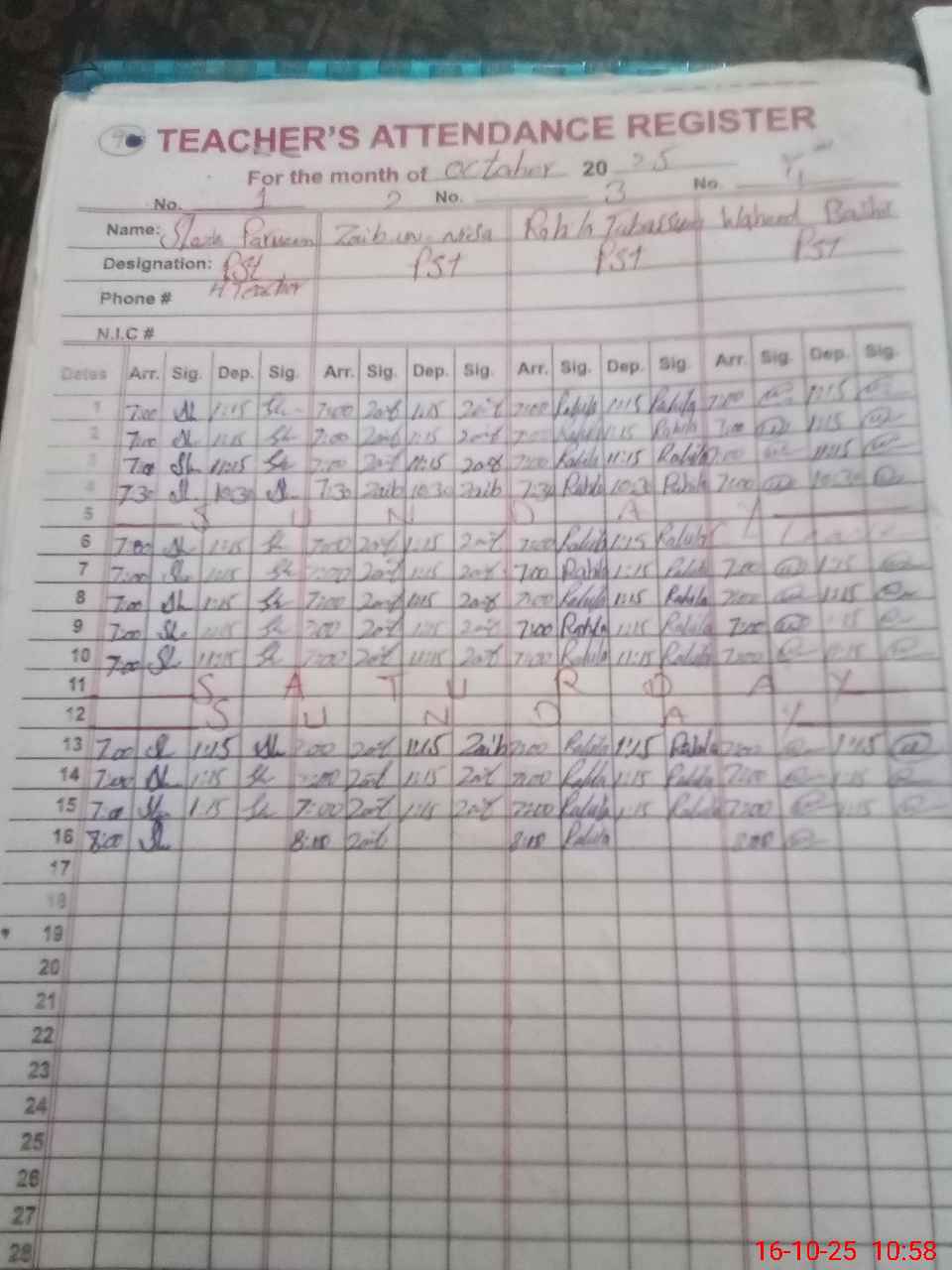 | CNIC | Full Name | Designation | R/C | Absence During Last Calender Month |