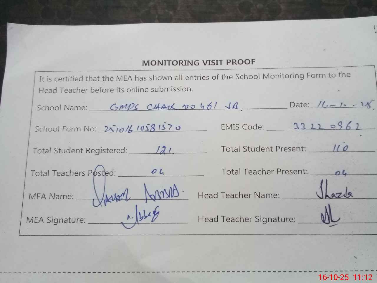 | Attendance Register | Head Teacher | MEA with School | Visit Proof |