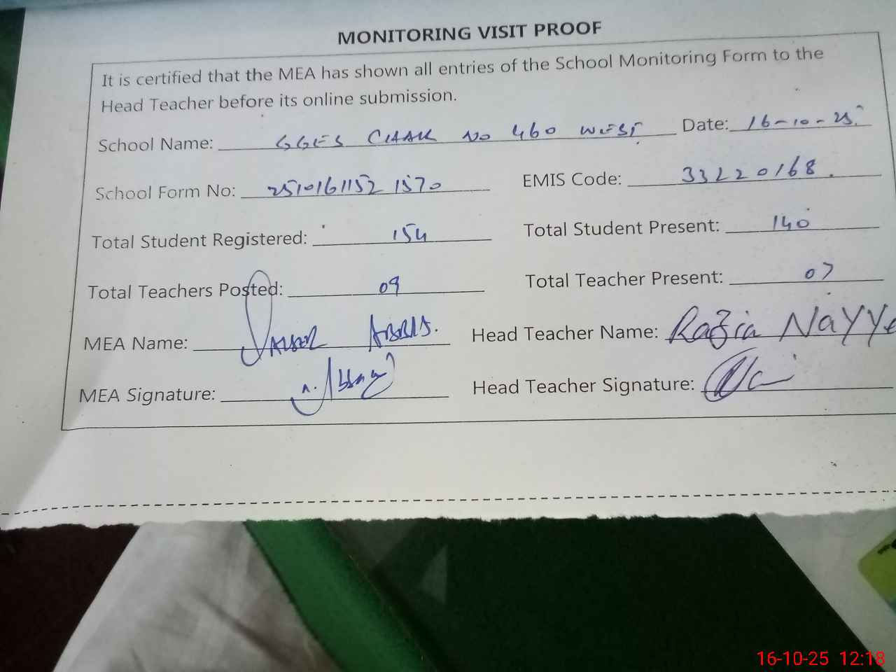 | Attendance Register | Head Teacher | MEA with School | Visit Proof |