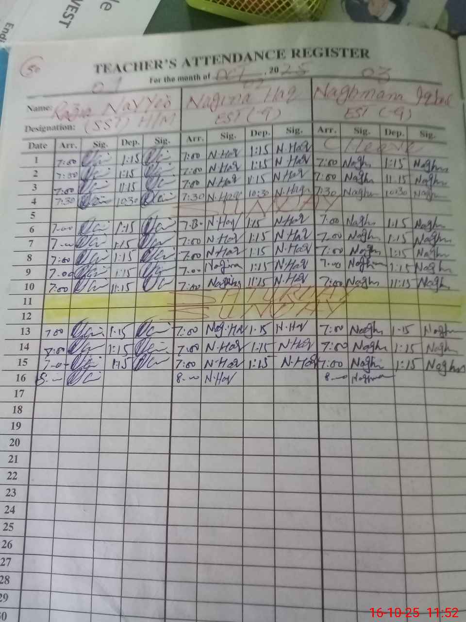 | CNIC | Full Name | Designation | R/C | Absence During Last Calender Month |
