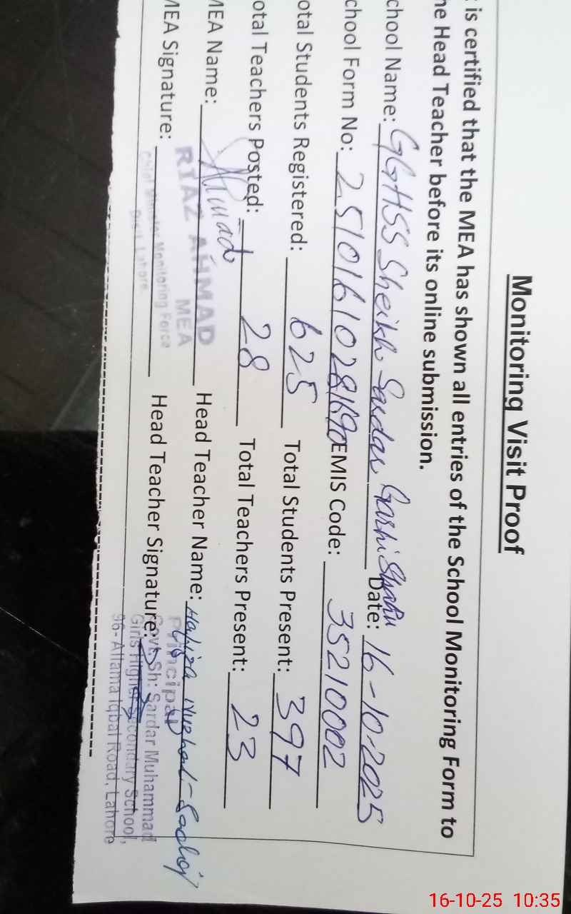 | EMIS Code: 35210002 | Name of School: GGHSS SHEIKH SARDAR MUHAMMAD GARHI SHAHU | |||