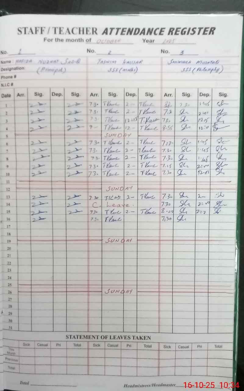 | Remarks (Use Separate Page if Required): Teacher Arfa tabussam absent since may 2025 Faiza Zafar and Zunaira transferred out still showing on teachers list | |||||