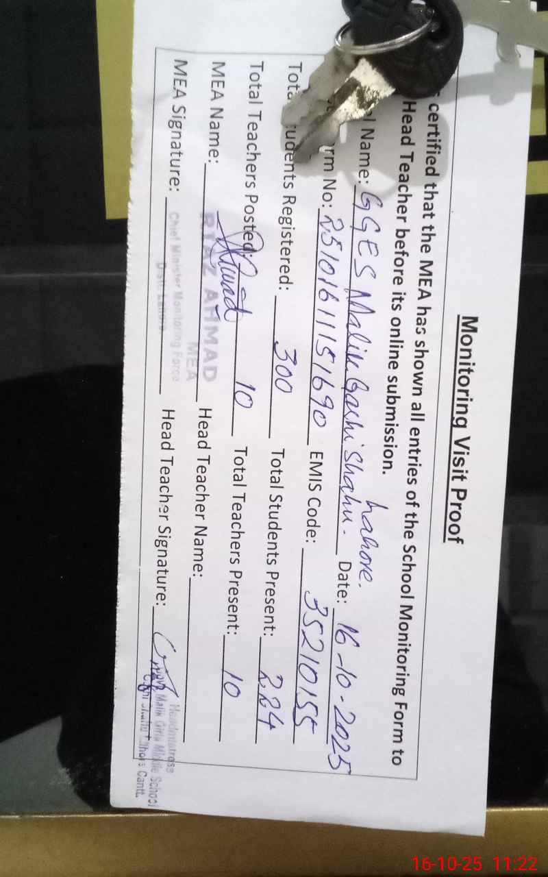 | EMIS Code: 35210155 | Name of School: GGES MALIK GARHI SHAHU LAHORE | |||