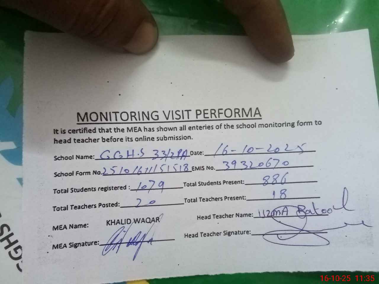 | Name: Uz**** Ba**** Designation: (School Headmaster's/Headmistress's) HM Phone/Cell Number: 03**** |