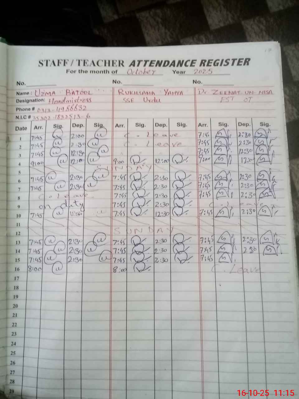 | CNIC | Full Name | Designation | R/C | Absence during last cal. month |