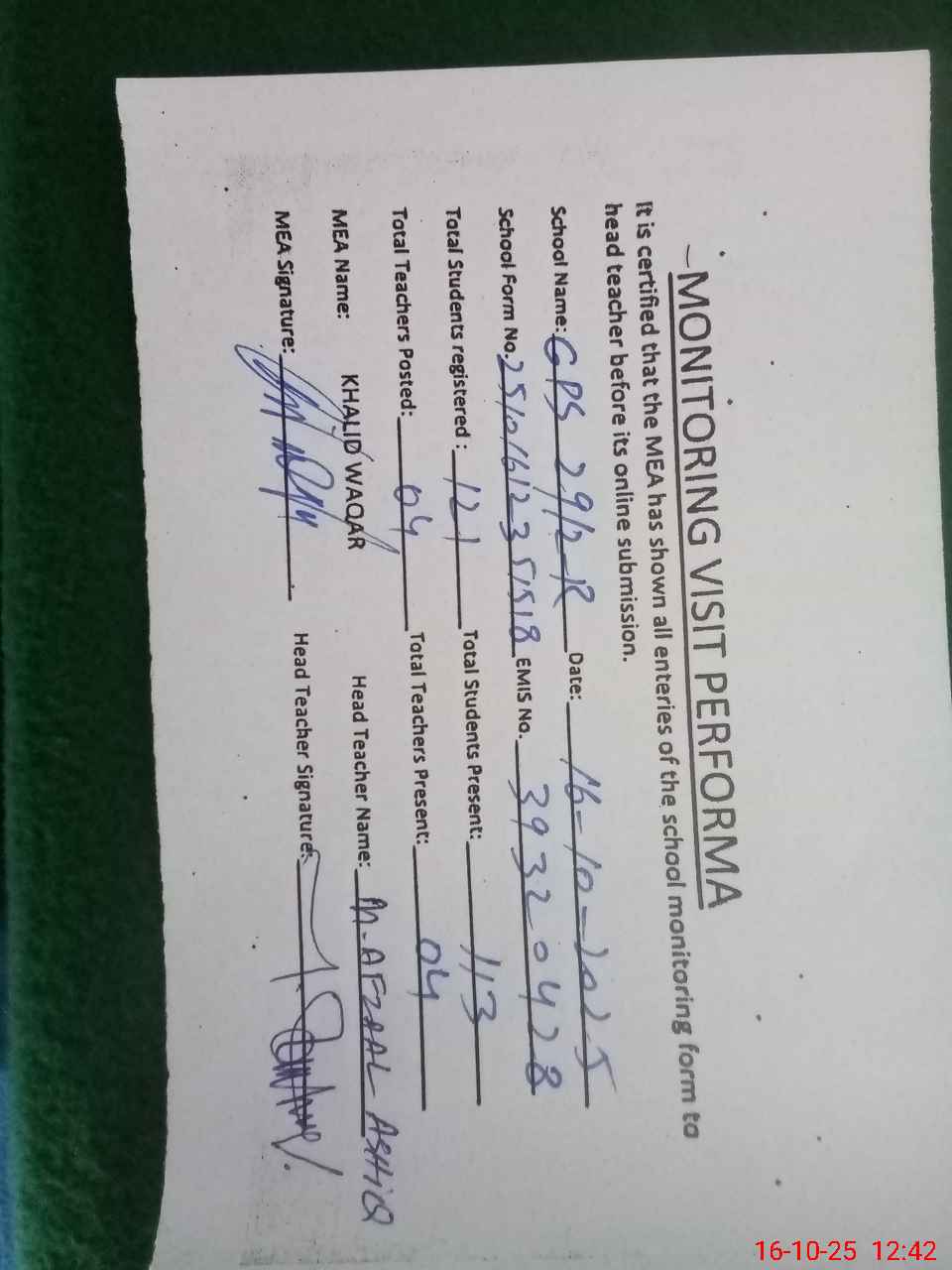 | Attendance Register | Head Teacher | MEA with School | Visit Proof |