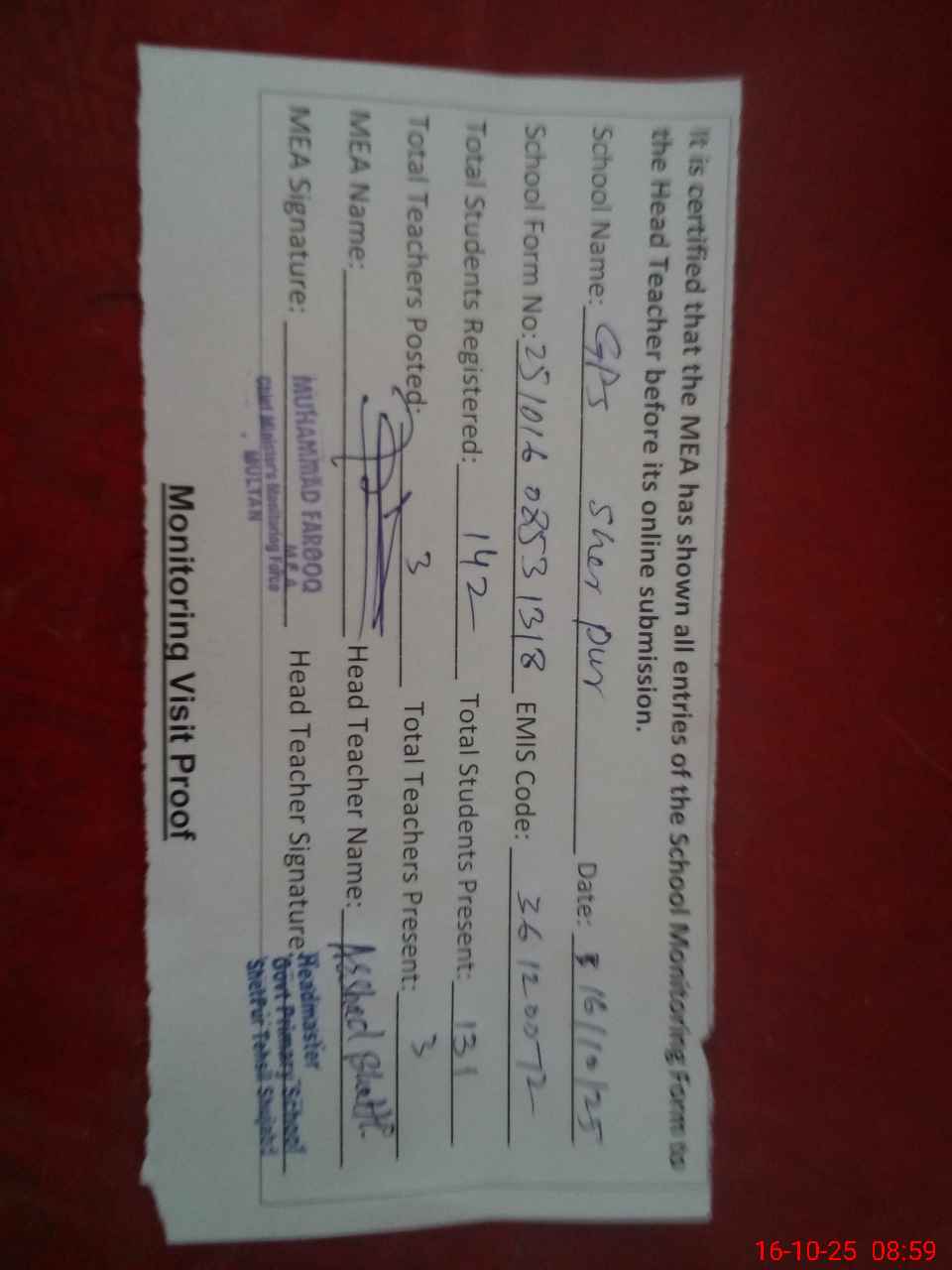 | EMIS Code: 36120072 | Name of School: GPS SHER PUR P/O & TEH SHUJABAD | |||