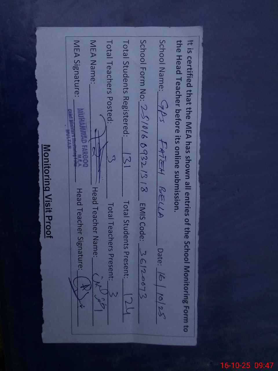 | EMIS Code: 36120073 | Name of School: GPS FATEH BELLA P/O & TEH.SHUJABAD | |||
