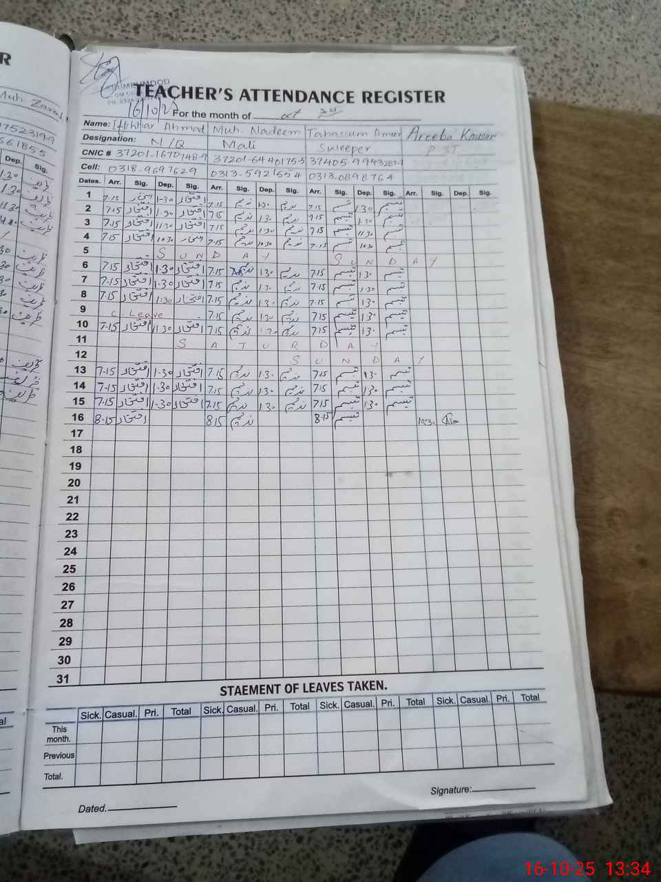 | CNIC | Full Name | Designation | R/C | Absence during last cal. month |