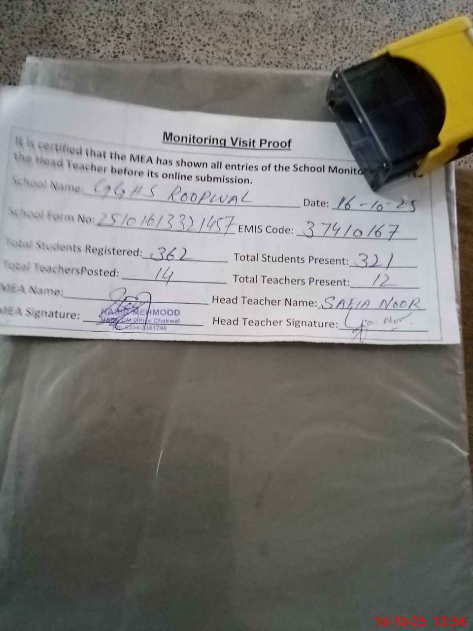 | Attendance Register | Head Teacher | MEA with School | Visit Proof |