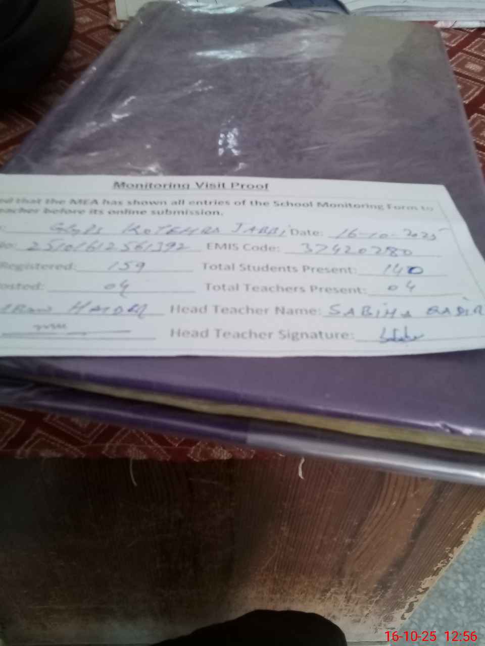 | Attendance Register | Head Teacher | MEA with School | Visit Proof |