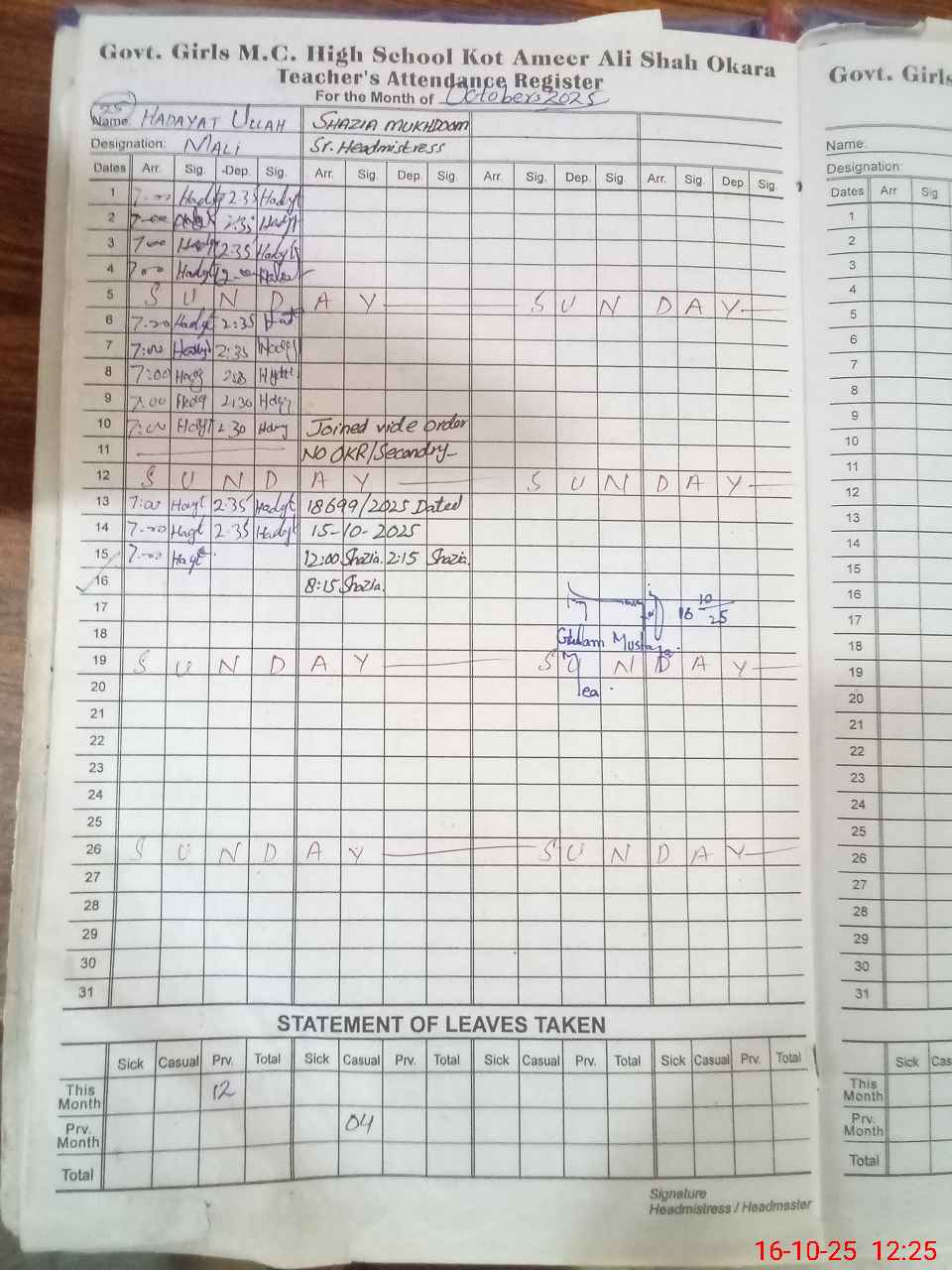| Total no. of Classrooms: 15 No. of Classrooms Used for Teaching: 11 No. of Classrooms Storing Old Furniture, FTBs, etc: 0Comments if Any: Nominal roll for online attendance found contrary to current available students records All enrolled students provided with free text books accordingly Senior head teacher Shazia Makhdoom posted on permanent strength from GGHS 32 2L found present on he |