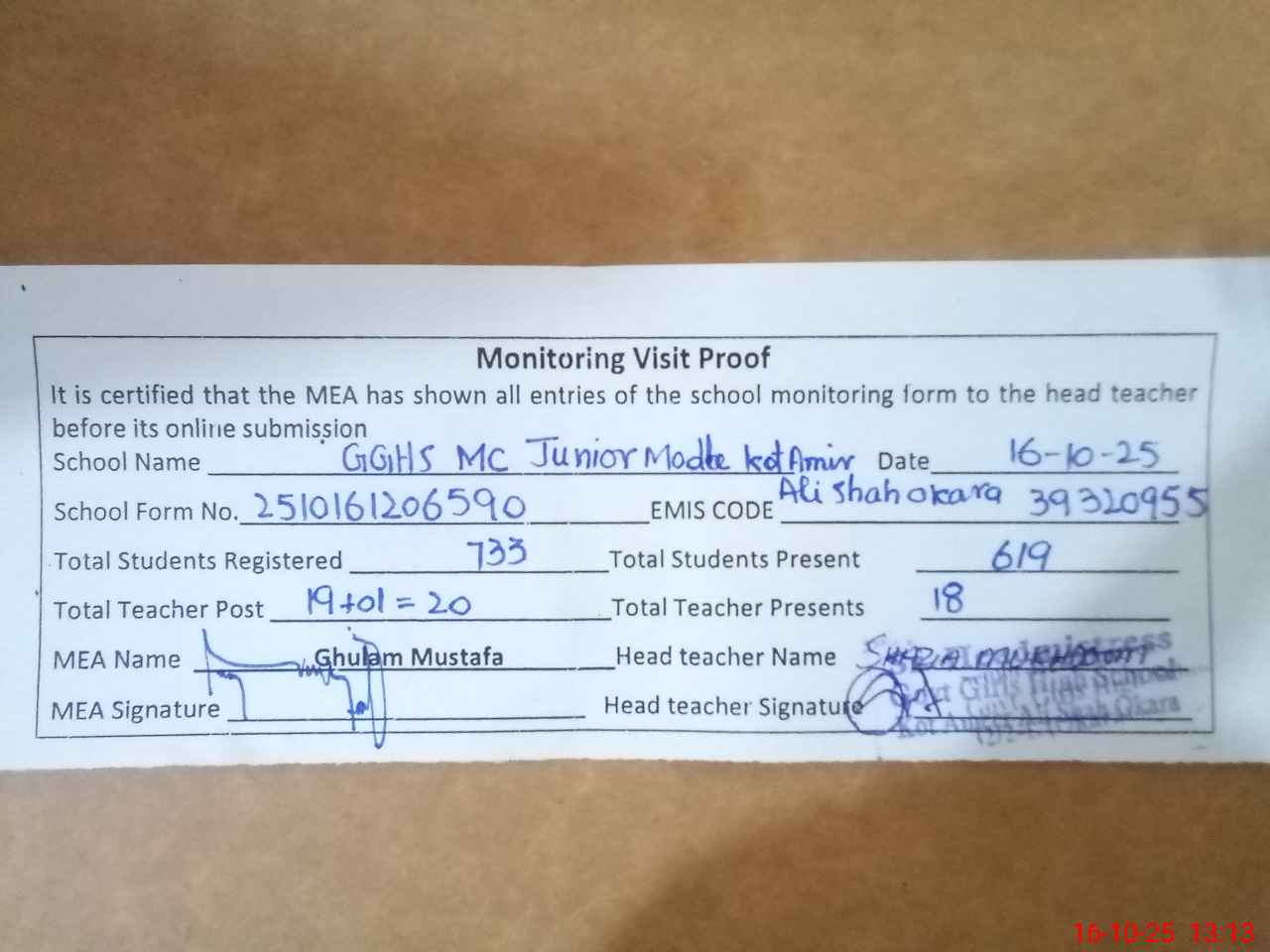 | EMIS Code: 39320955 | Name of School: GGHS MC JUNIOR MODEL KOT AMIR ALI SHAH OKARA | |||