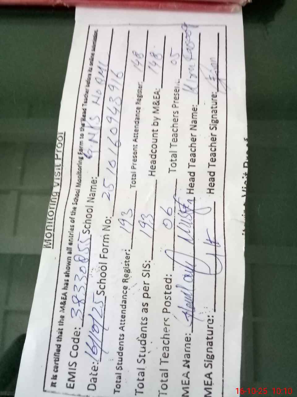 | Attendance Register | Head Teacher | MEA with School | Visit Proof |