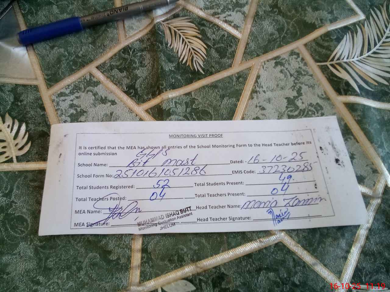 | Monitoring Date: 16-10-2025 | Start Time: 16-10-2025 10:51 AM | End Time: 16-10-2025 11:19 AM | Name of MEA: Mu**** Is**** bu**** | |