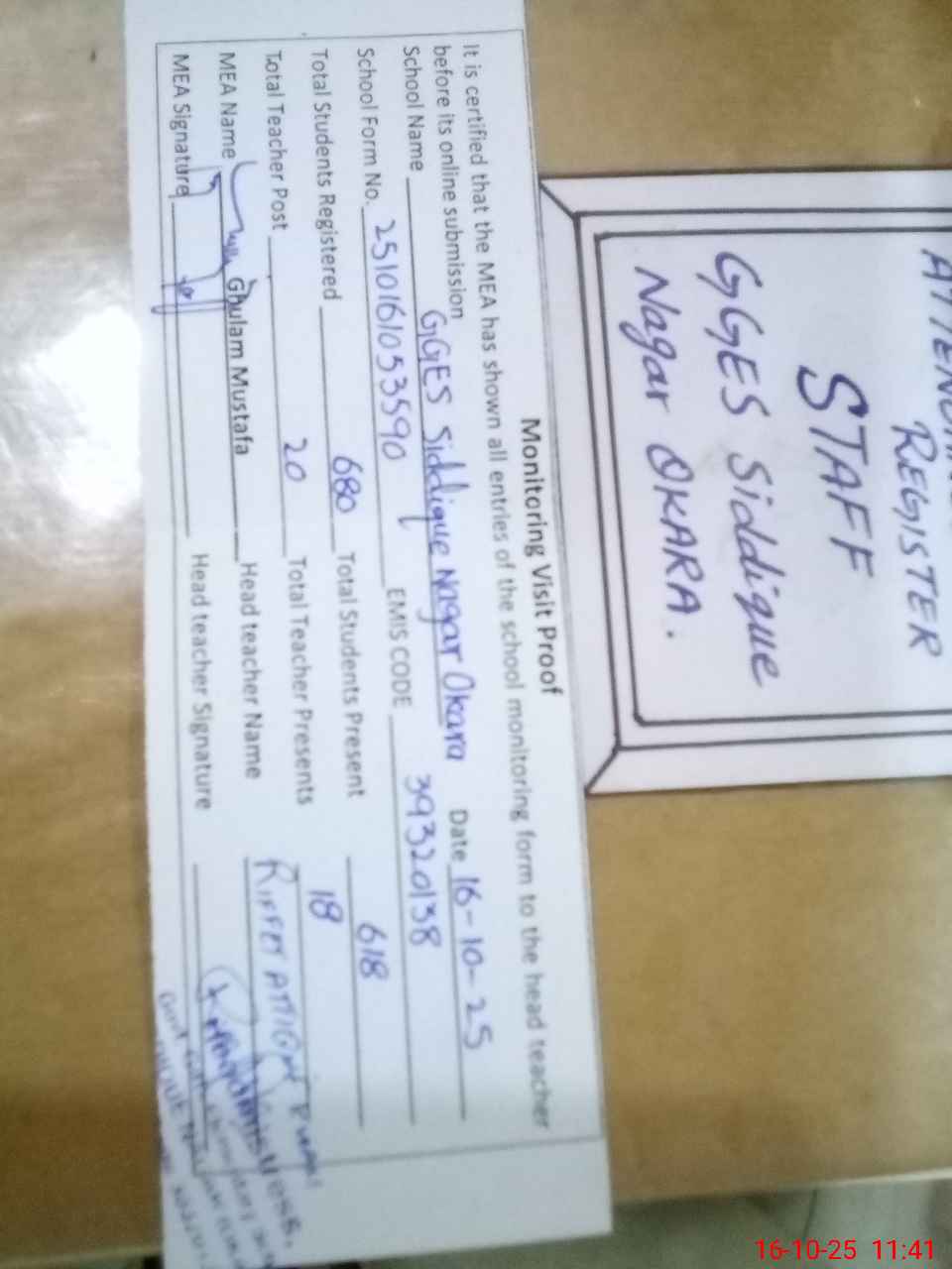 | Attendance Register | Head Teacher | MEA with School | Visit Proof |
