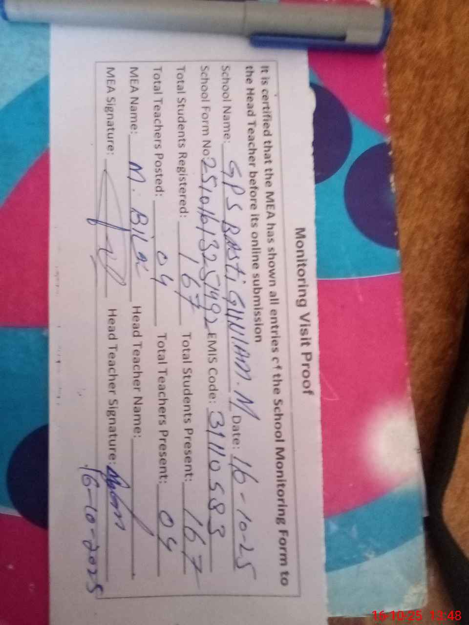 | Certified that this School was Inspected by the Undersigned MEA/DMO Today and the Information Stated Above is as Per Record. | |||||