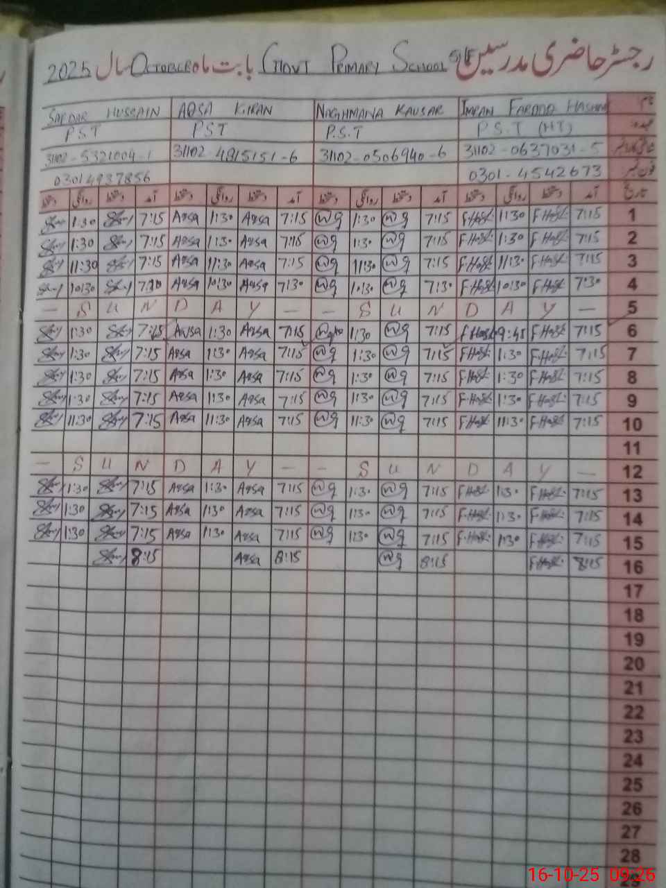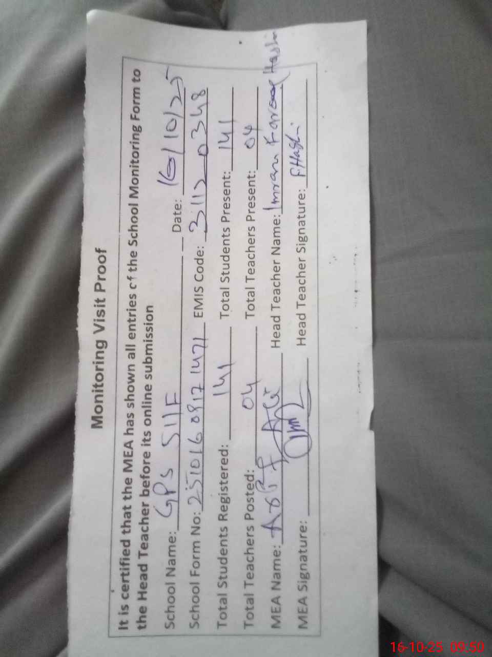 | Name: IM**** FA**** HA**** Designation: (School Headmaster's/Headmistress's) PST Phone/Cell Number: 03**** |