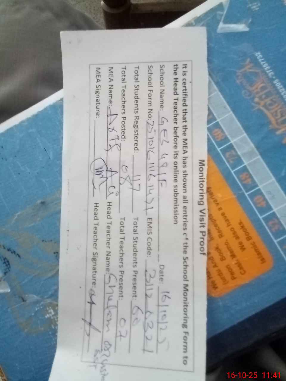 | Attendance Register | Head Teacher | MEA with School | Visit Proof |