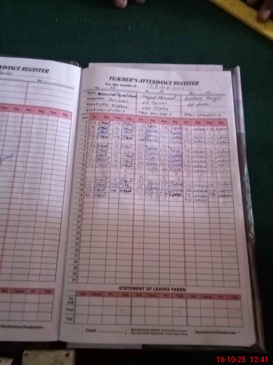 | CNIC | Full Name | Designation | R/C | Absence During Last Calender Month |