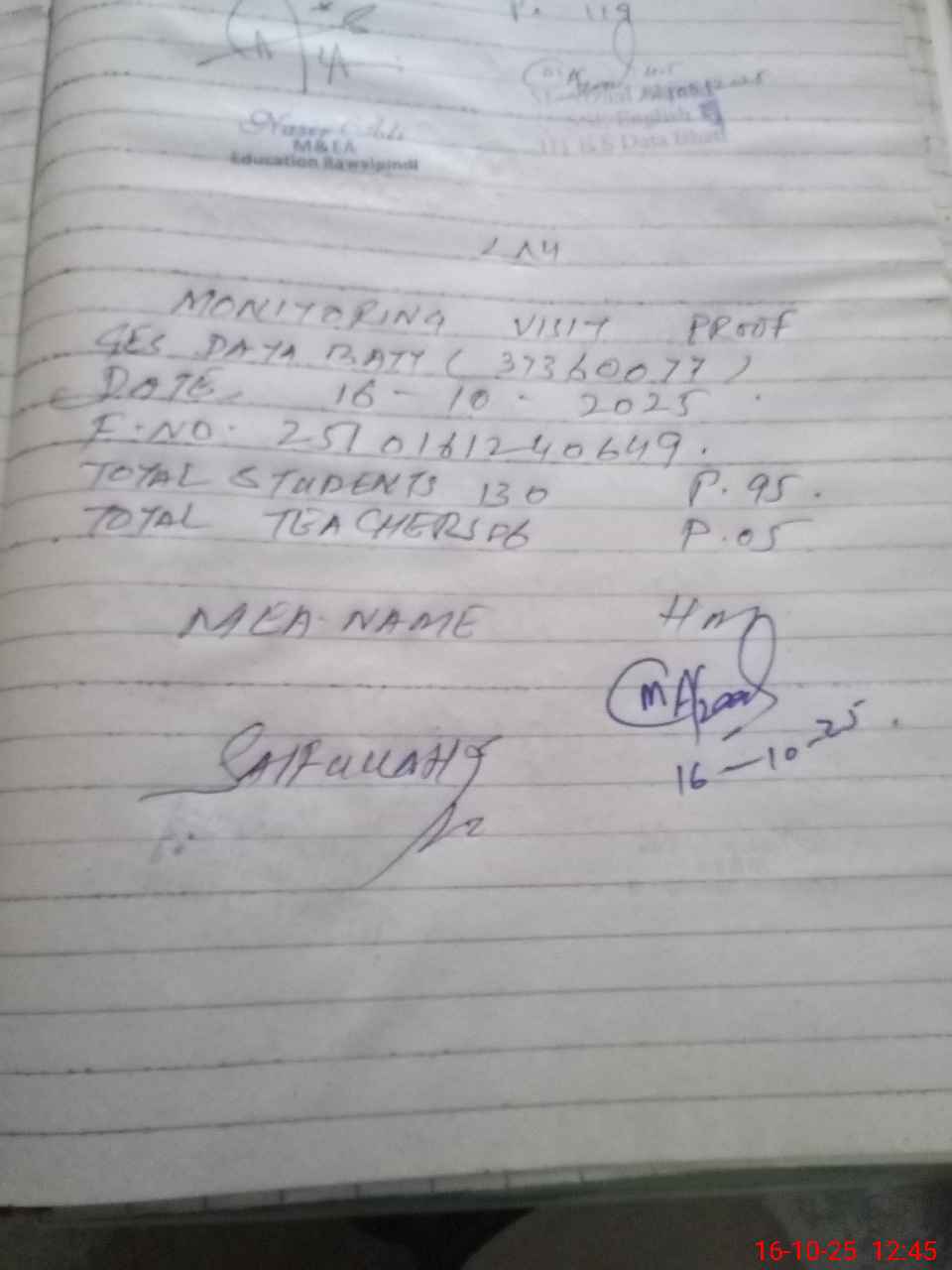 | Attendance Register | Head Teacher | MEA with School | Visit Proof |