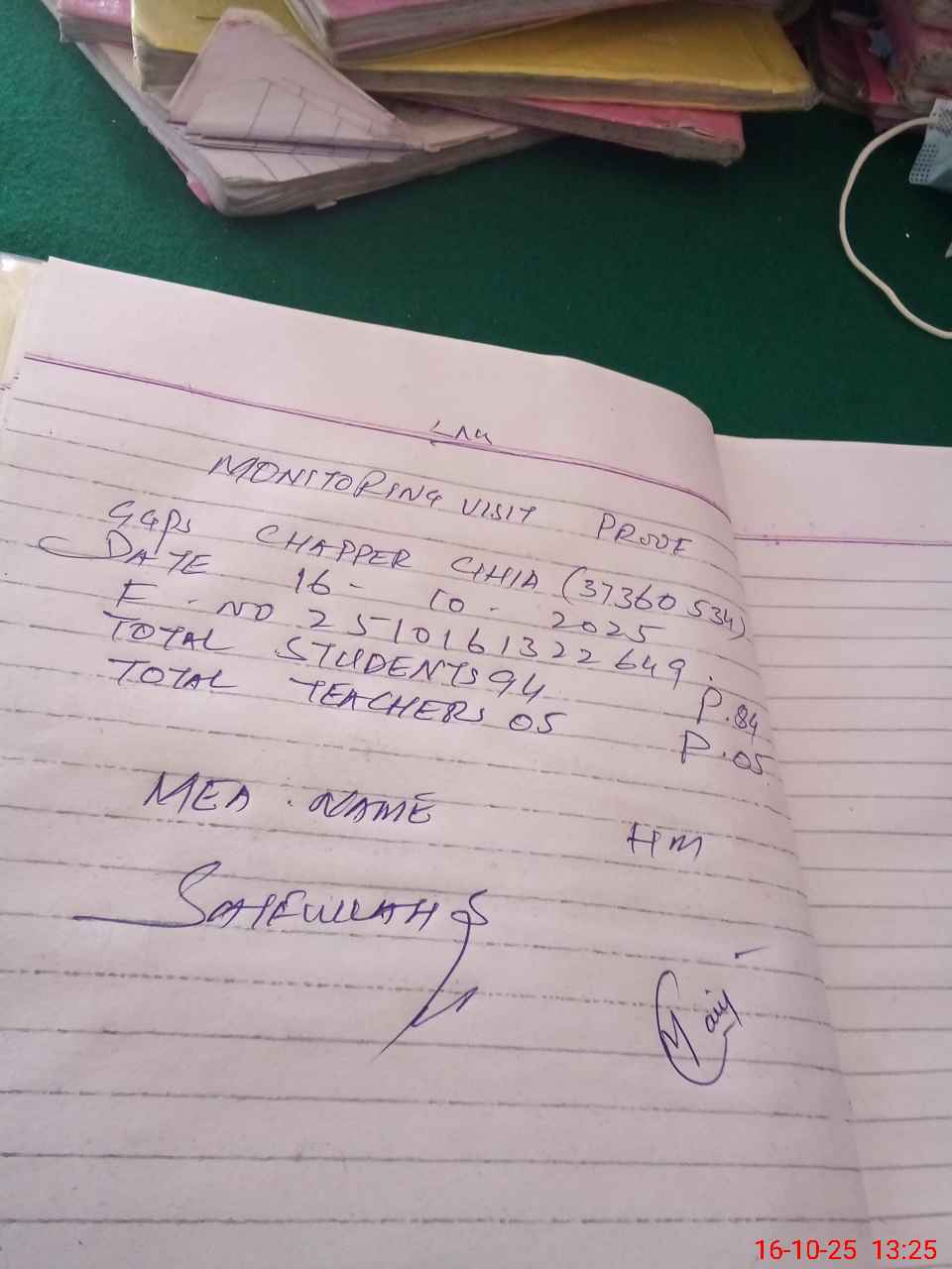 | Attendance Register | Head Teacher | MEA with School | Visit Proof |