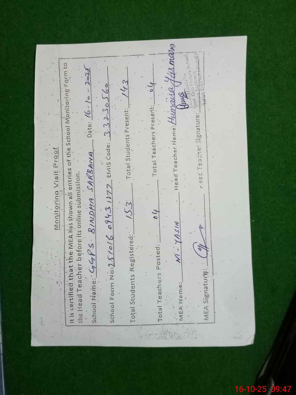 | EMIS Code: 33230560 | Name of School: GGPS BINDAH SARBANA | |||