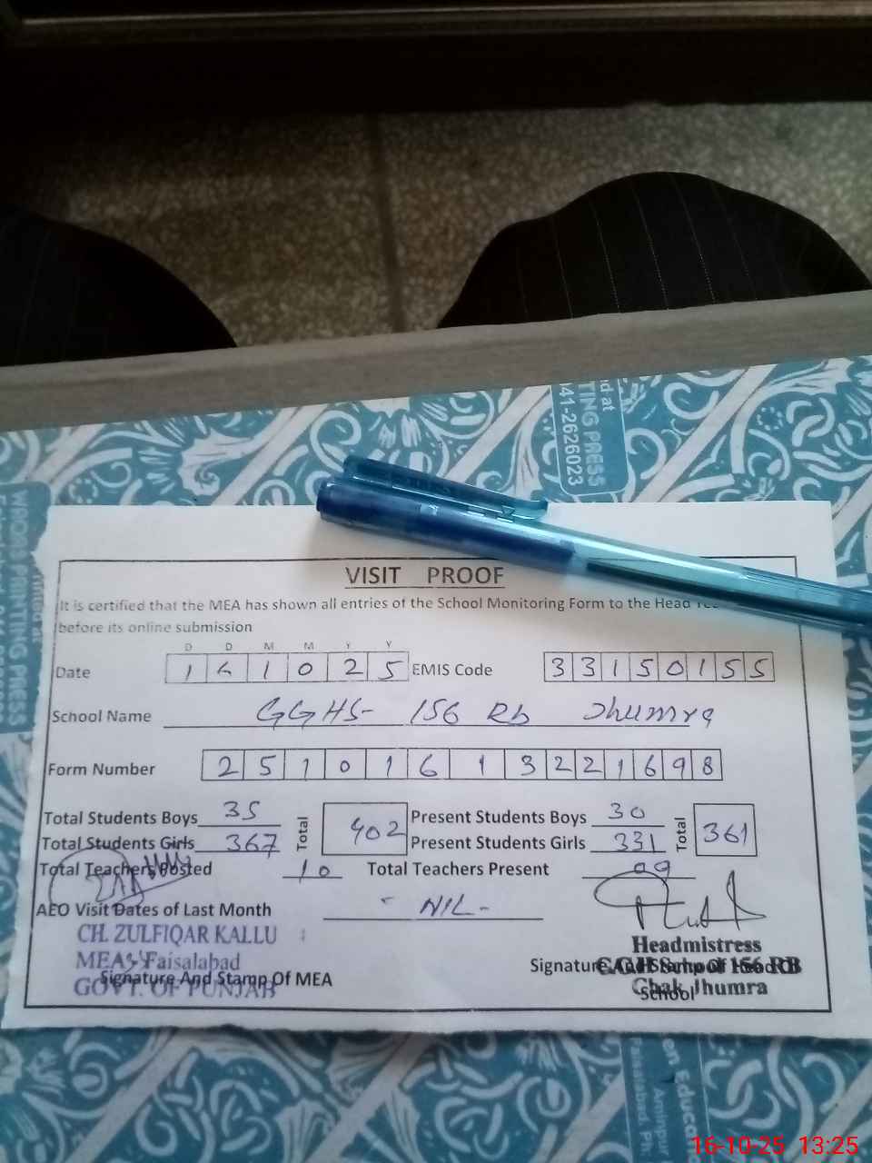 | Certified that this School was Inspected by the Undersigned MEA/DMO Today and the Information Stated Above is as Per Record. | |||||