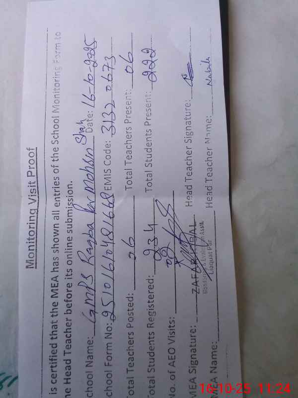 | EMIS Code: 31320673 | Name of School: GMPS RAQBA PIR MOHSIN SHAH | |||