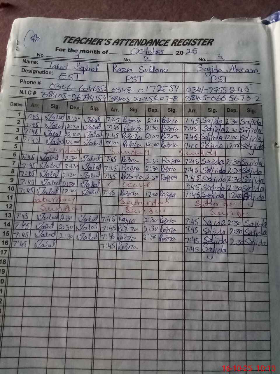 | CNIC | Full Name | Designation | R/C | Absence during last cal. month |