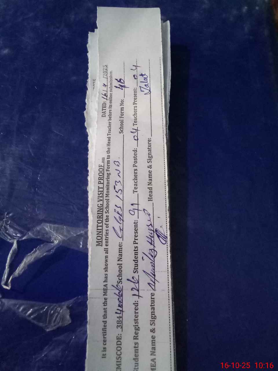 | Monitoring Date: 16-10-2025 | Start Time: 16-10-2025 09:57 AM | End Time: 16-10-2025 10:24 AM | Name of MEA: MU**** HU**** | |