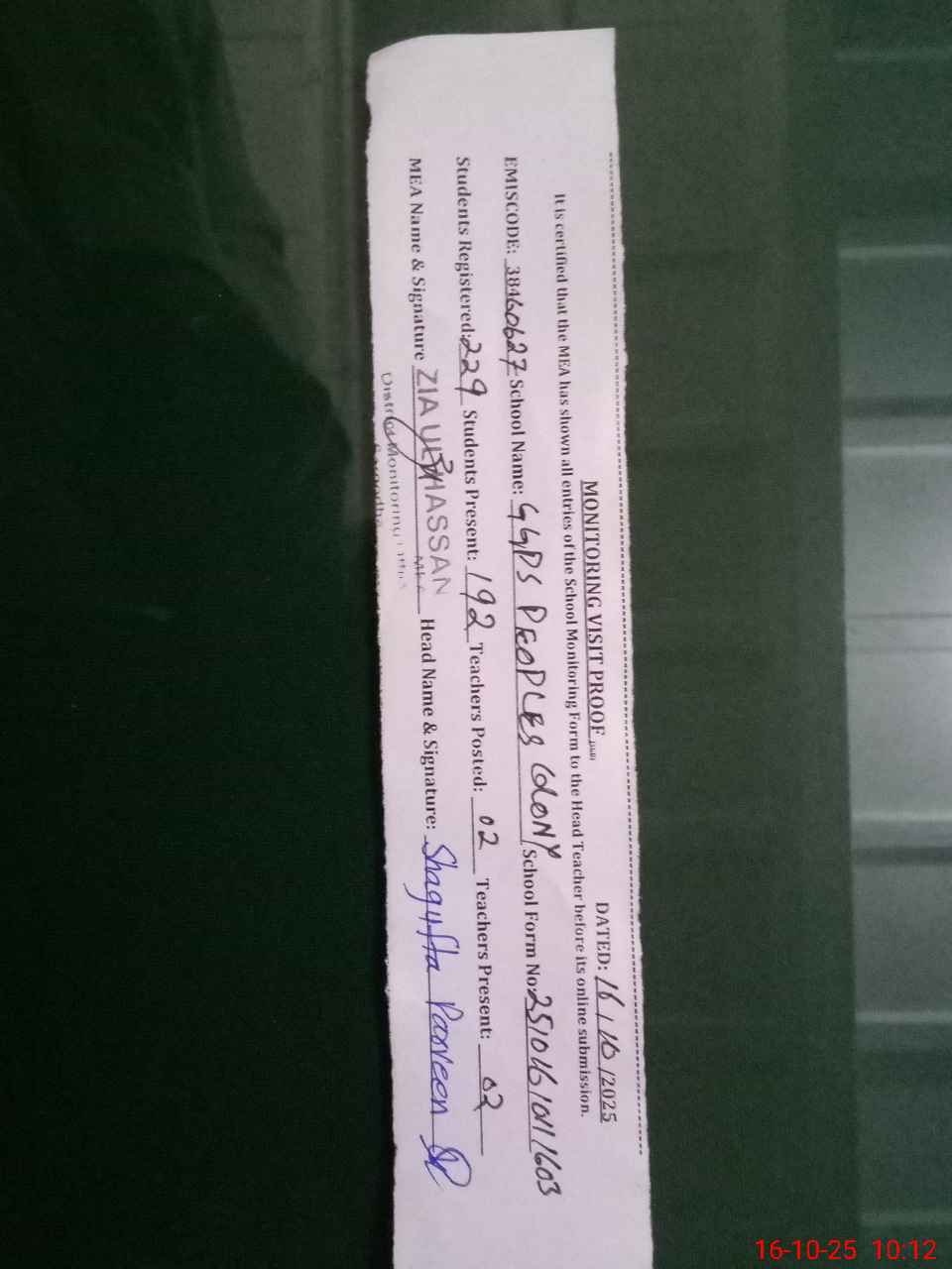 | Monitoring Date: 16-10-2025 | Start Time: 16-10-2025 09:51 AM | End Time: 16-10-2025 10:13 AM | Name of MEA: ZI**** ULHA**** | |