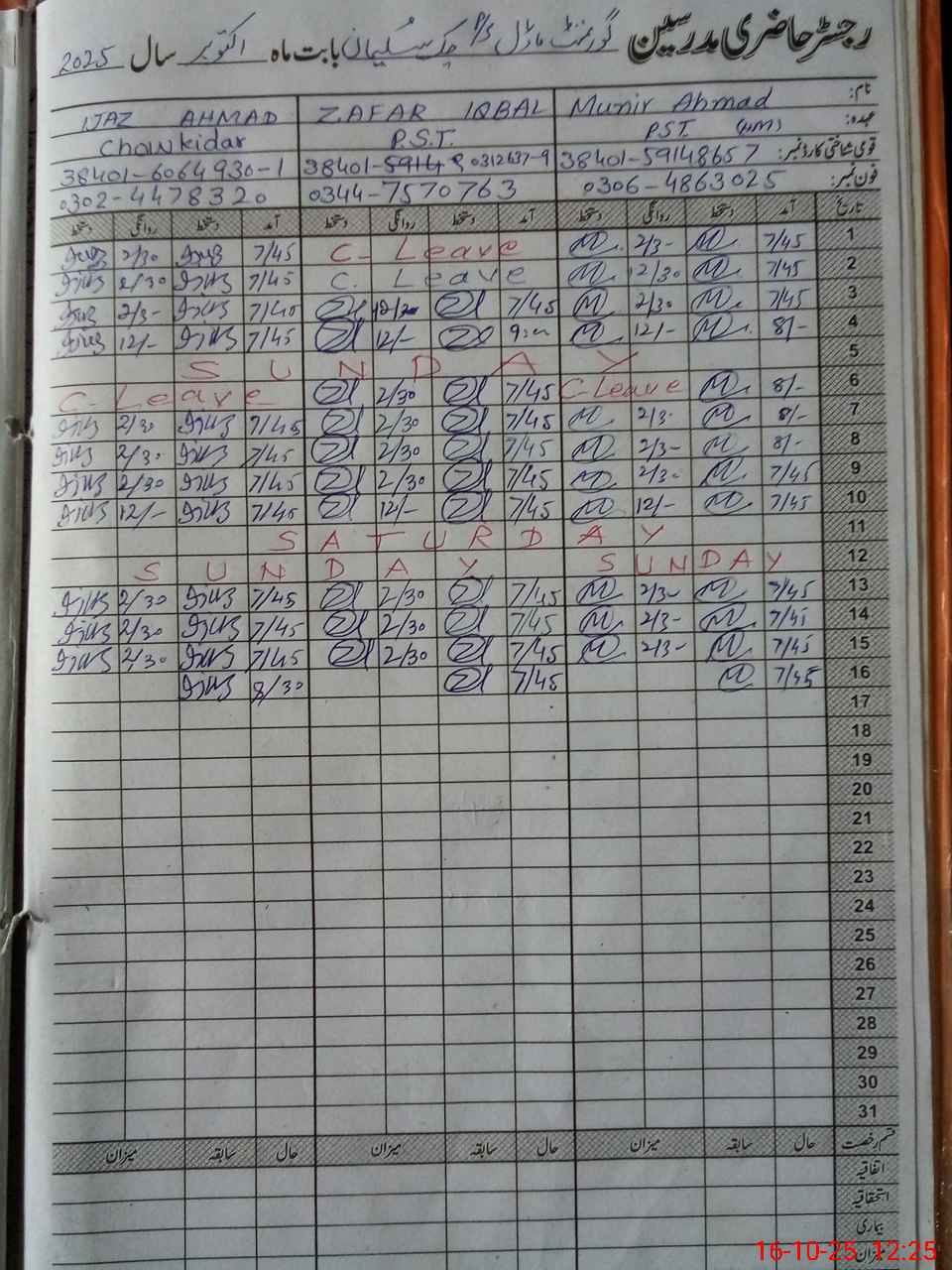 | CNIC | Full Name | Designation | R/C | Absence during last cal. month |