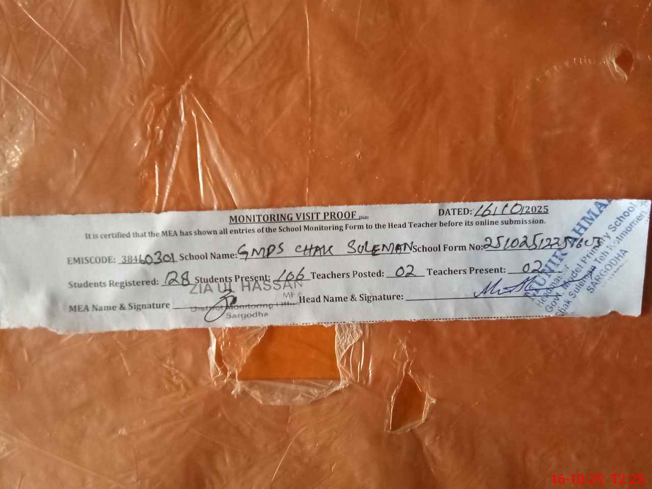 | Monitoring Date: 16-10-2025 | Start Time: 16-10-2025 11:59 AM | End Time: 16-10-2025 12:26 PM | Name of MEA: ZI**** ULHA**** | |