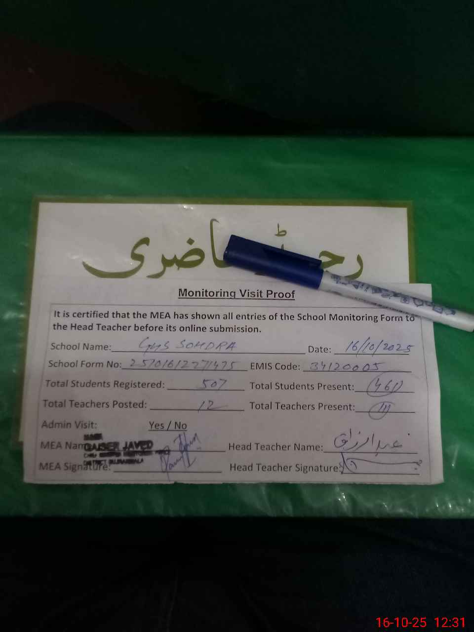 | Attendance Register | Head Teacher | MEA with School | Visit Proof |