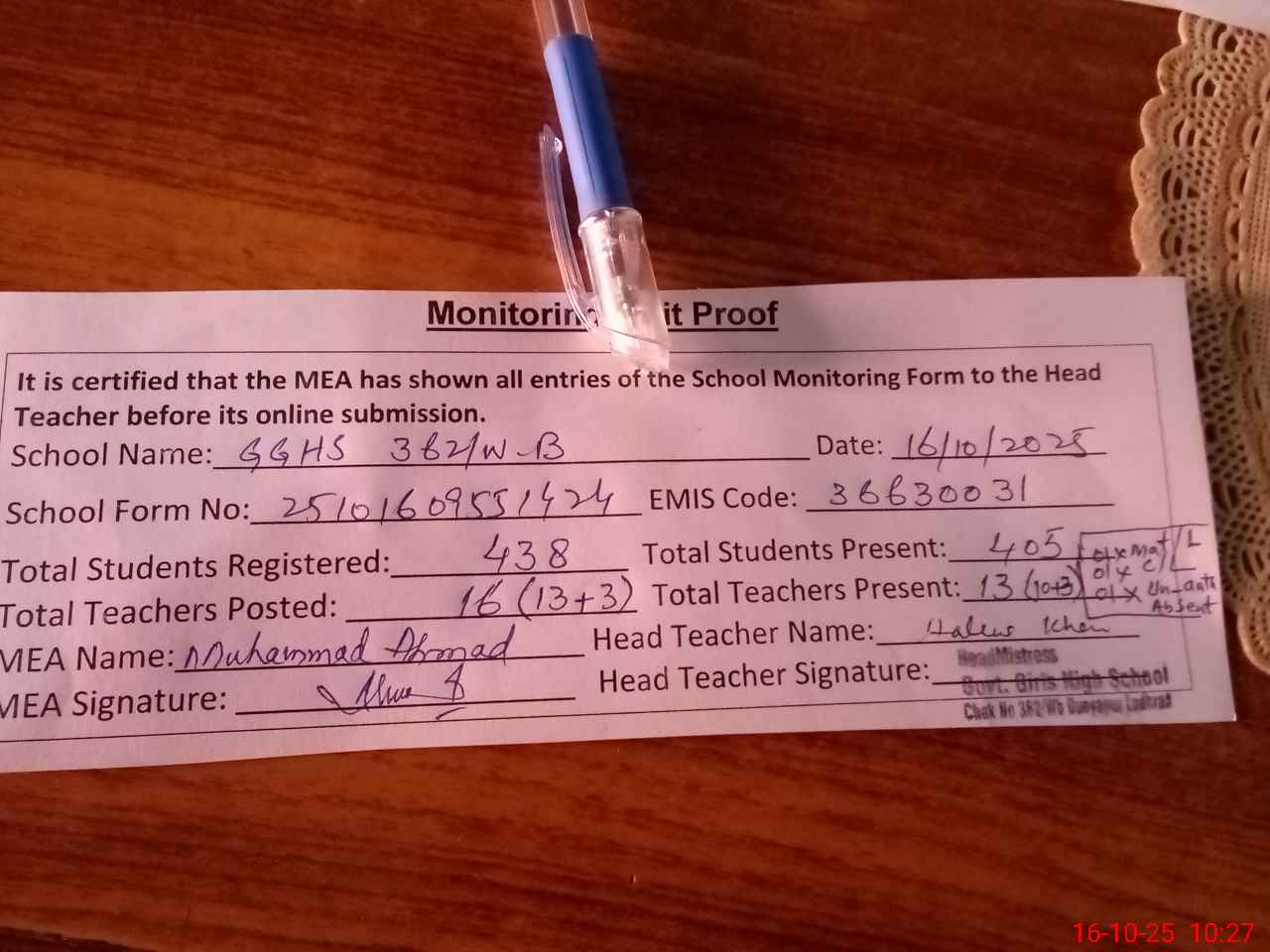 | Attendance Register | Head Teacher | MEA with School | Visit Proof |