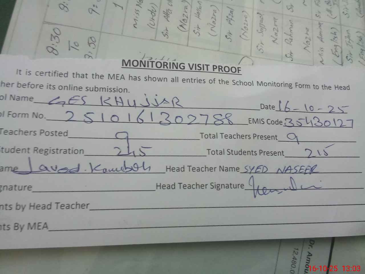 | Certified that this School was Inspected by the Undersigned MEA/DMO Today and the Information Stated Above is as Per Record. | |||||