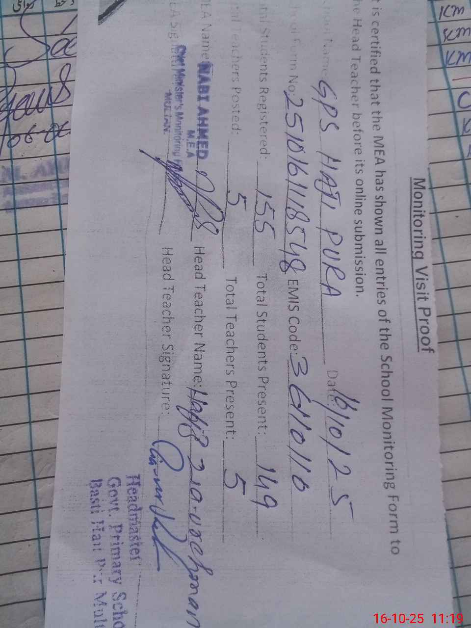 | Certified that this School was Inspected by the Undersigned MEA/DMO Today and the Information Stated Above is as Per Record. | |||||