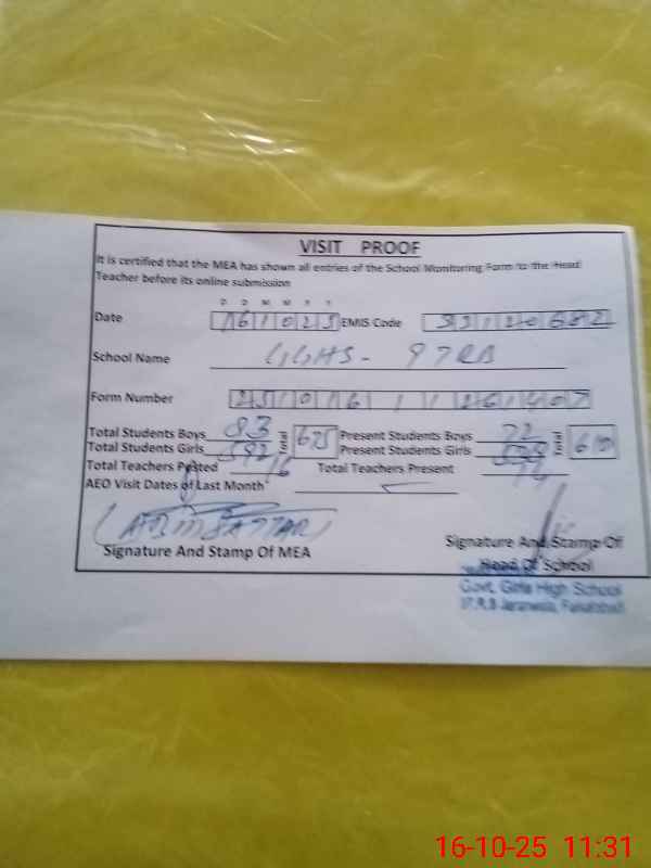 | EMIS Code: 33120682 | Name of School: GGHS CHAK NO 97 RB | |||