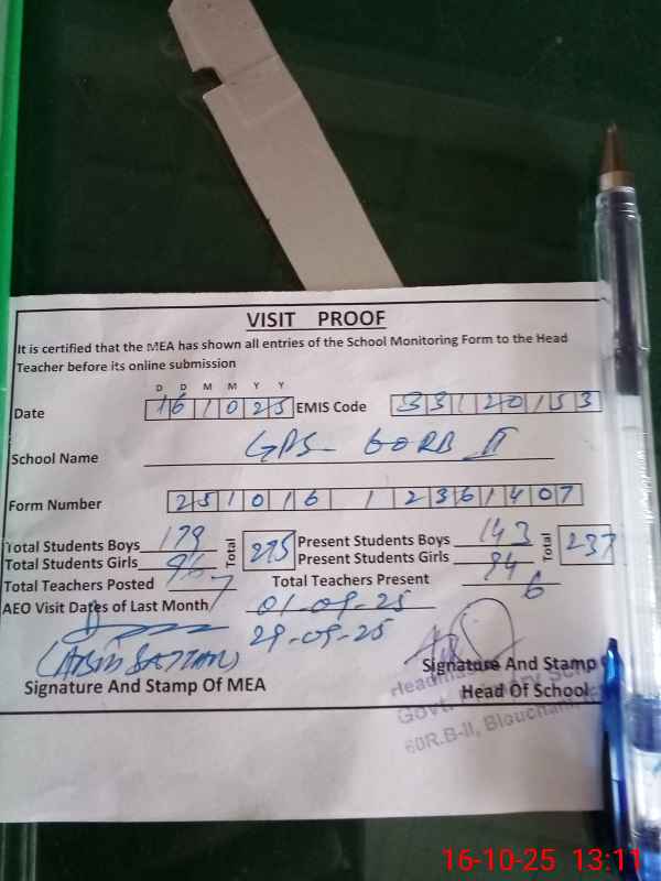 | Attendance Register | Head Teacher | MEA with School | Visit Proof |