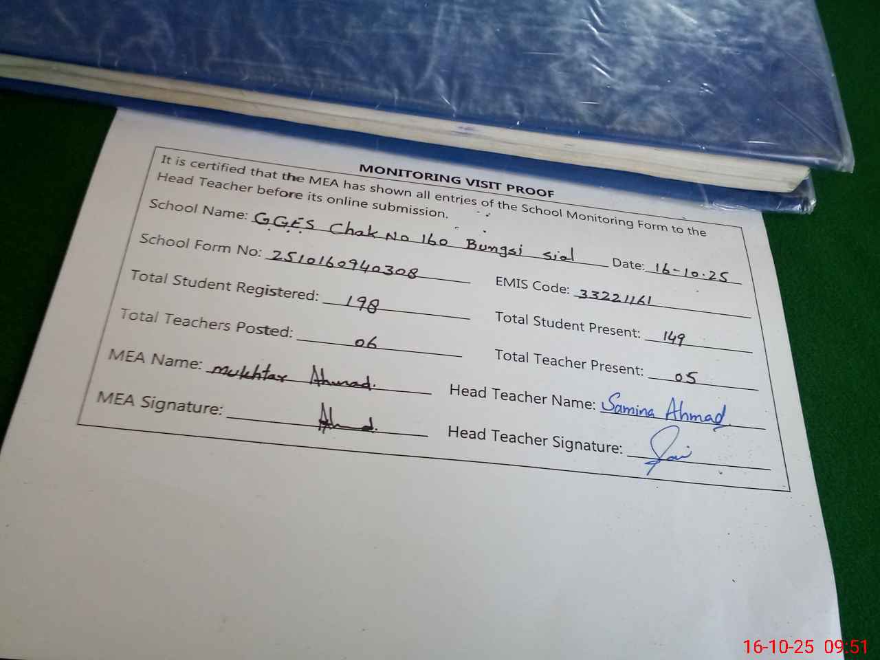 | Certified that this School was Inspected by the Undersigned MEA/DMO Today and the Information Stated Above is as Per Record. | |||||