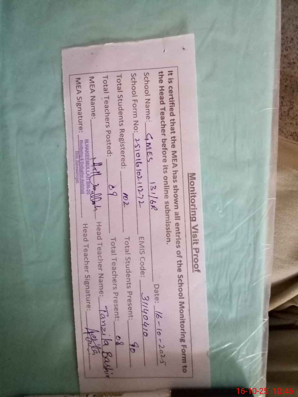 | Attendance Register | Head Teacher | MEA with School | Visit Proof |