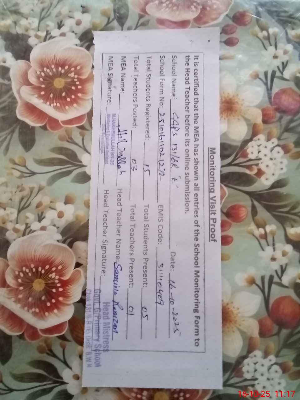 | Attendance Register | Head Teacher | MEA with School | Visit Proof |