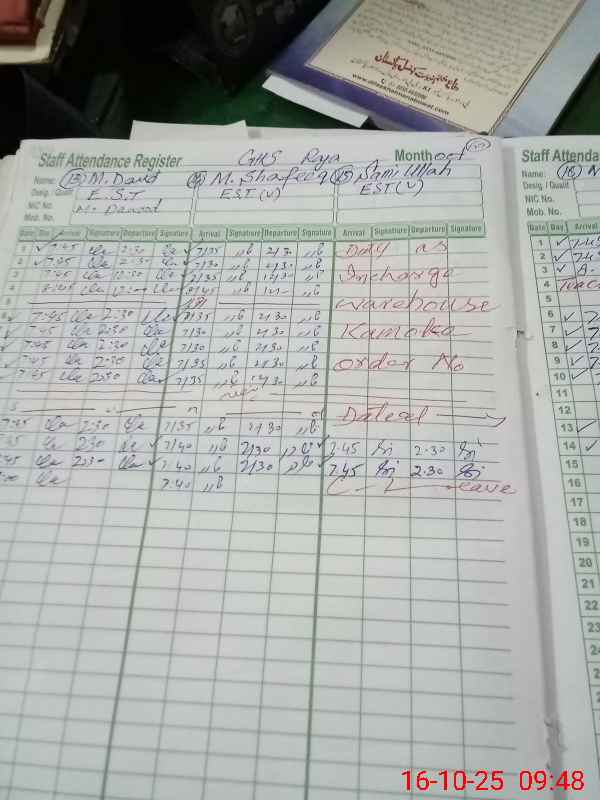 | CNIC | Full Name | Designation | R/C | Absence During Last Calender Month |