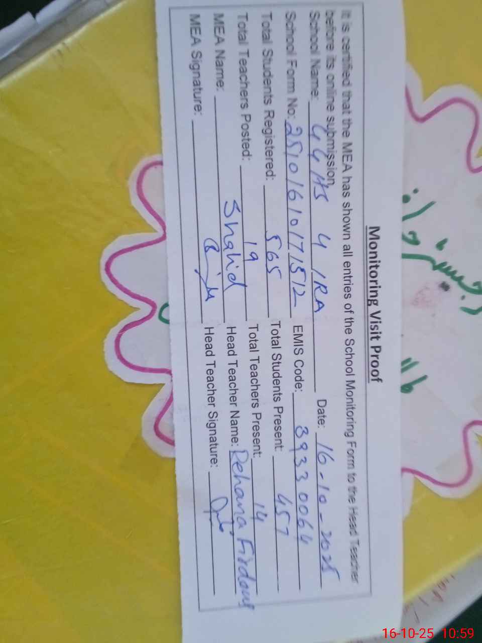 | Attendance Register | Head Teacher | MEA with School | Visit Proof |