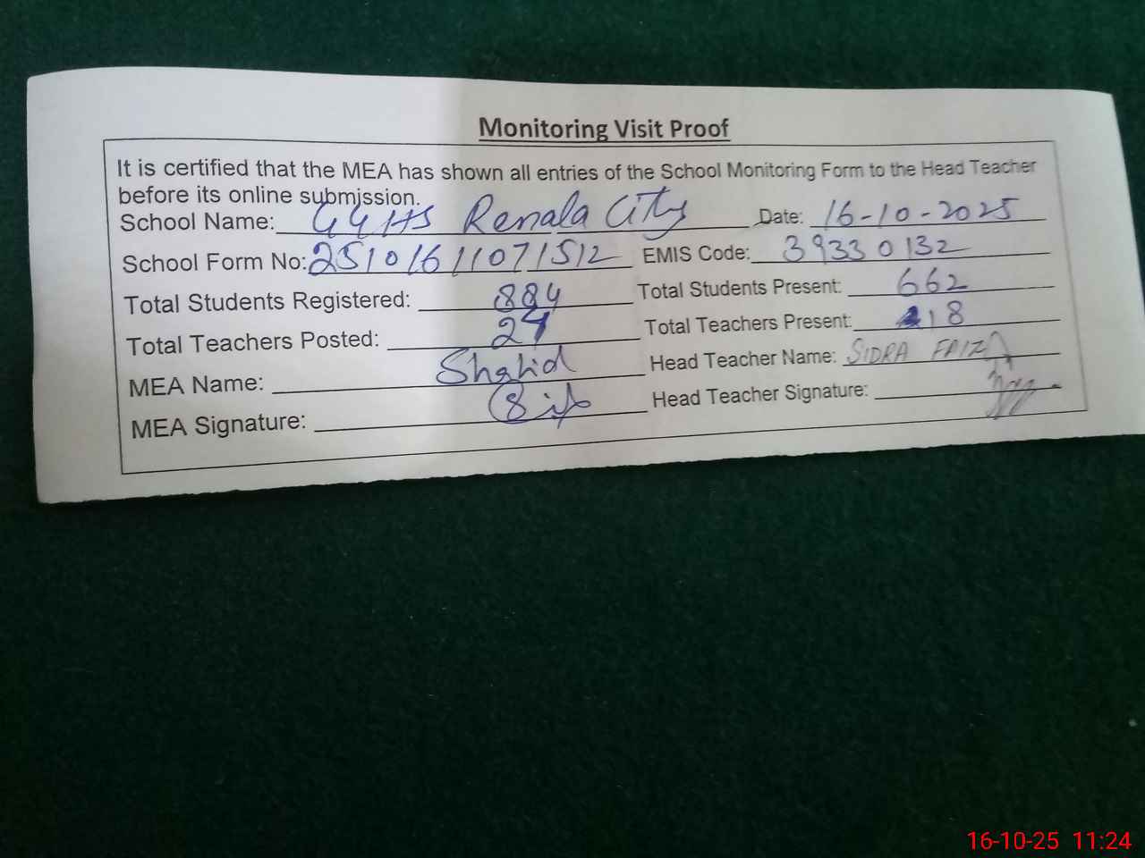 | Monitoring Date: 16-10-2025 | Start Time: 16-10-2025 11:02 AM | End Time: 16-10-2025 11:28 AM | Name of MEA: SH**** YO**** | |