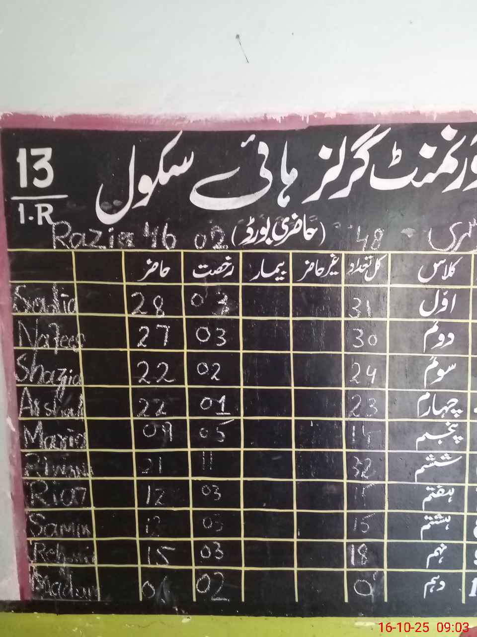 | Total Students Present | 0 | 0 | 50 | 28 | 22 | 20 | 17 | 13 | 25 | 18 | 12 | 14 | 3 | 222 | ||
